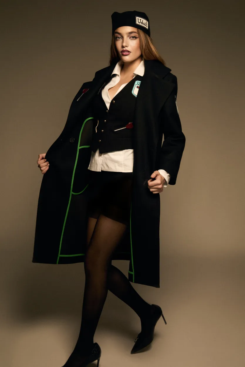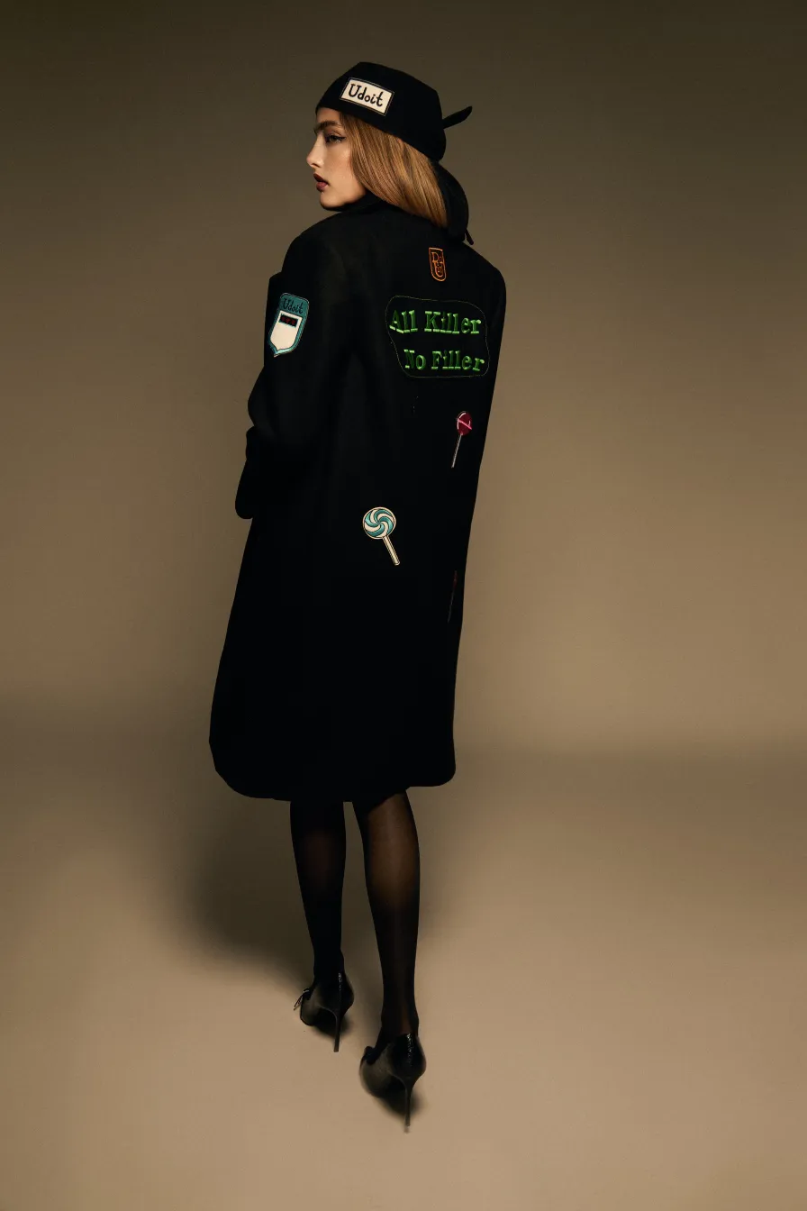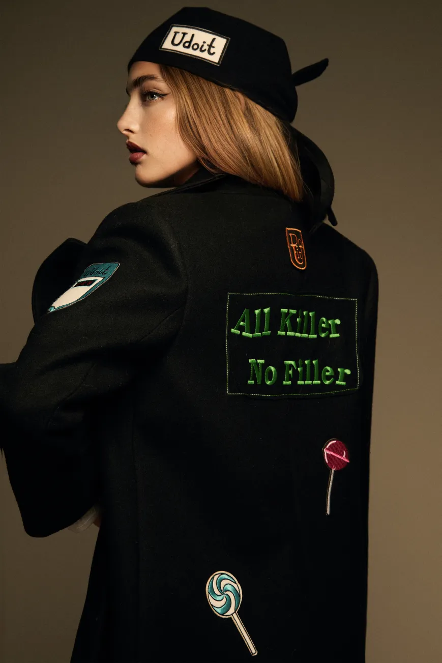 El abrigo Candy Shop es una prenda atemporal y divertida. De corte recto y cierre cruzado, está confeccionado en lana negra y decorado con originales parches de caramelos que le aportan un aire atrevido, junto a la frase icónica “All killer, no filler”. Con bolsillos funcionales y botones cruzados, su silueta larga equilibra a la perfección la sofisticación con la comodidad acogedora. Ideal para combinar con botas altas hasta la rodilla, es la elección perfecta para lucir un look chic y abrigado en los días fríos. El fit de la prenda es medio.