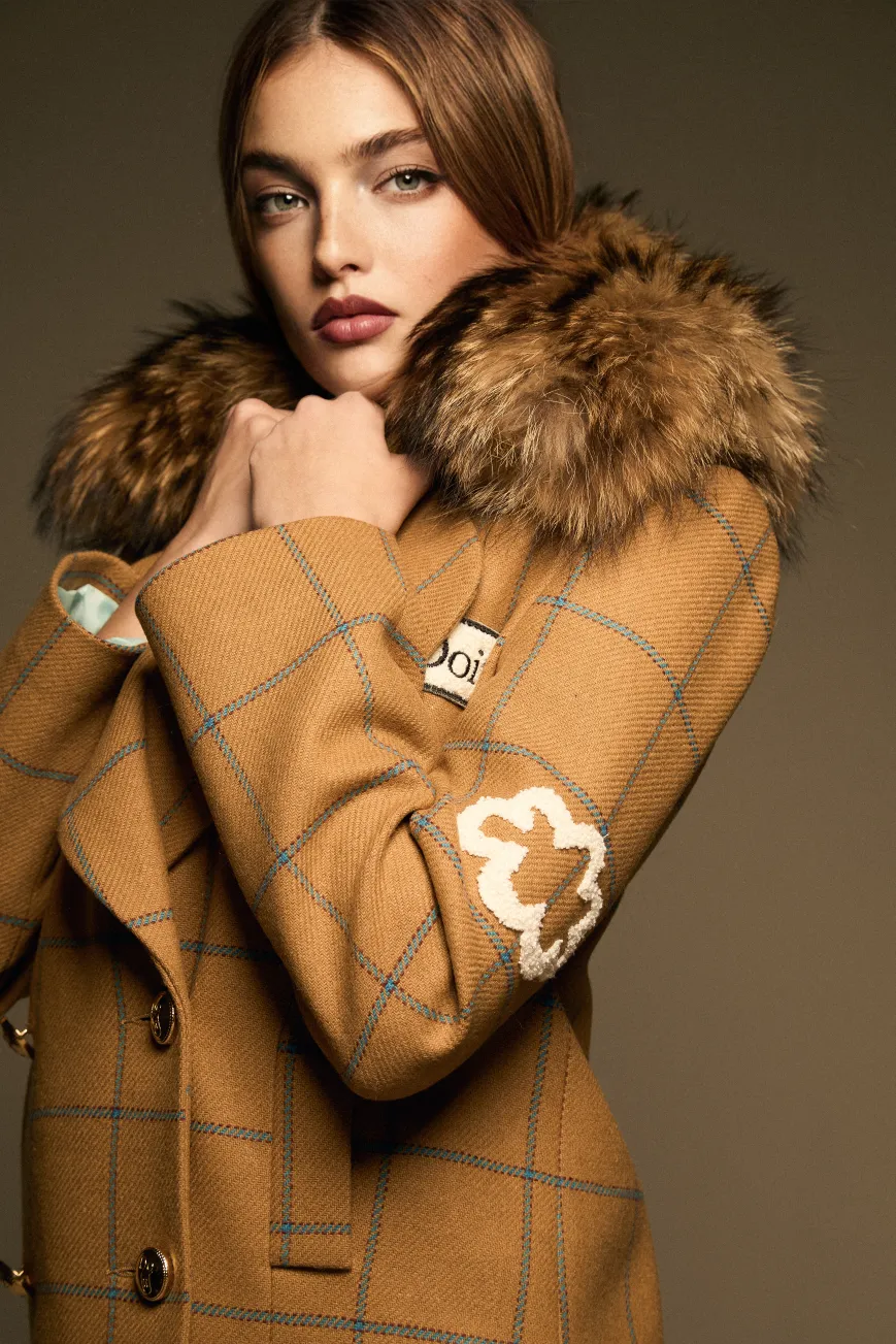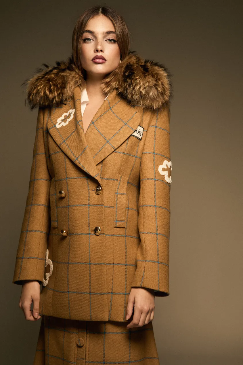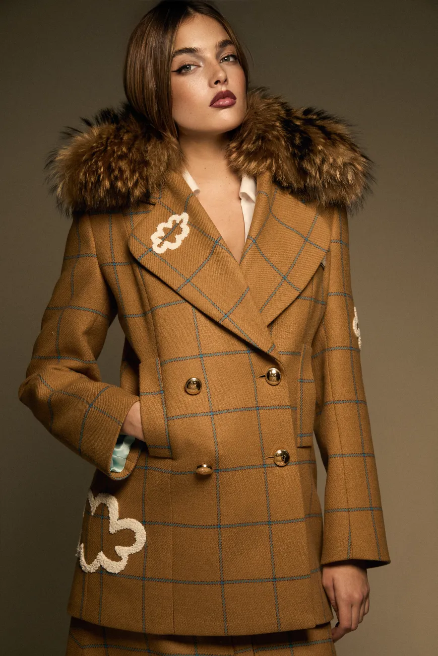 Nubes abrigo es una versátil prenda de invierno que fusiona una estructura entallada y recta con encantadores bordados. Confeccionado en un cálido cuadro camel con azul, cuenta con un espectacular cuello de piel natural que puedes quitar y poner cuando quieras. Con bolsillos delanteros y botones cruzados esta silueta equilibra la sofisticación vintage con la comodidad acogedora. Ideal para combinar con el set bandida y lucir un look chic en los días fríos. El fit de la prenda es medio.