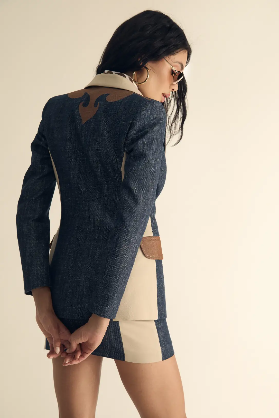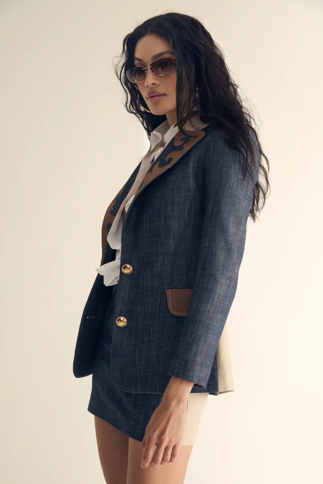 La Beyoncé Blazer es una blazer denim para mujer que reinventa la sastrería con una propuesta audaz y sofisticada. Confeccionada en denim estructurado de tono profundo, incorpora solapas en contraste beige y aplicaciones ornamentales que aportan carácter. Su corte entallado y cintura definida estilizan la silueta, mientras los botones dorados elevan el diseño. Perfecta para llevar en conjunto coordinado o combinar con prendas neutras para un look elegante con actitud.