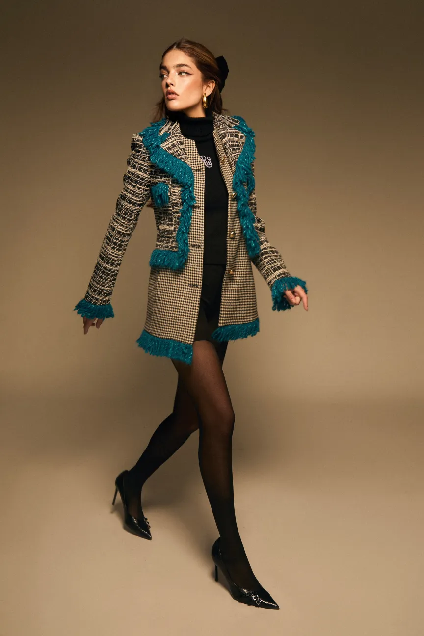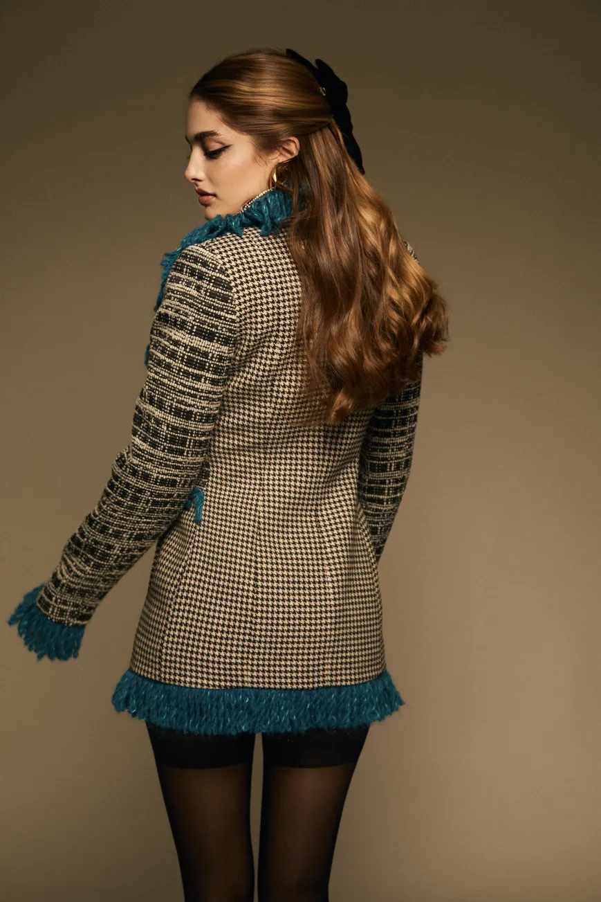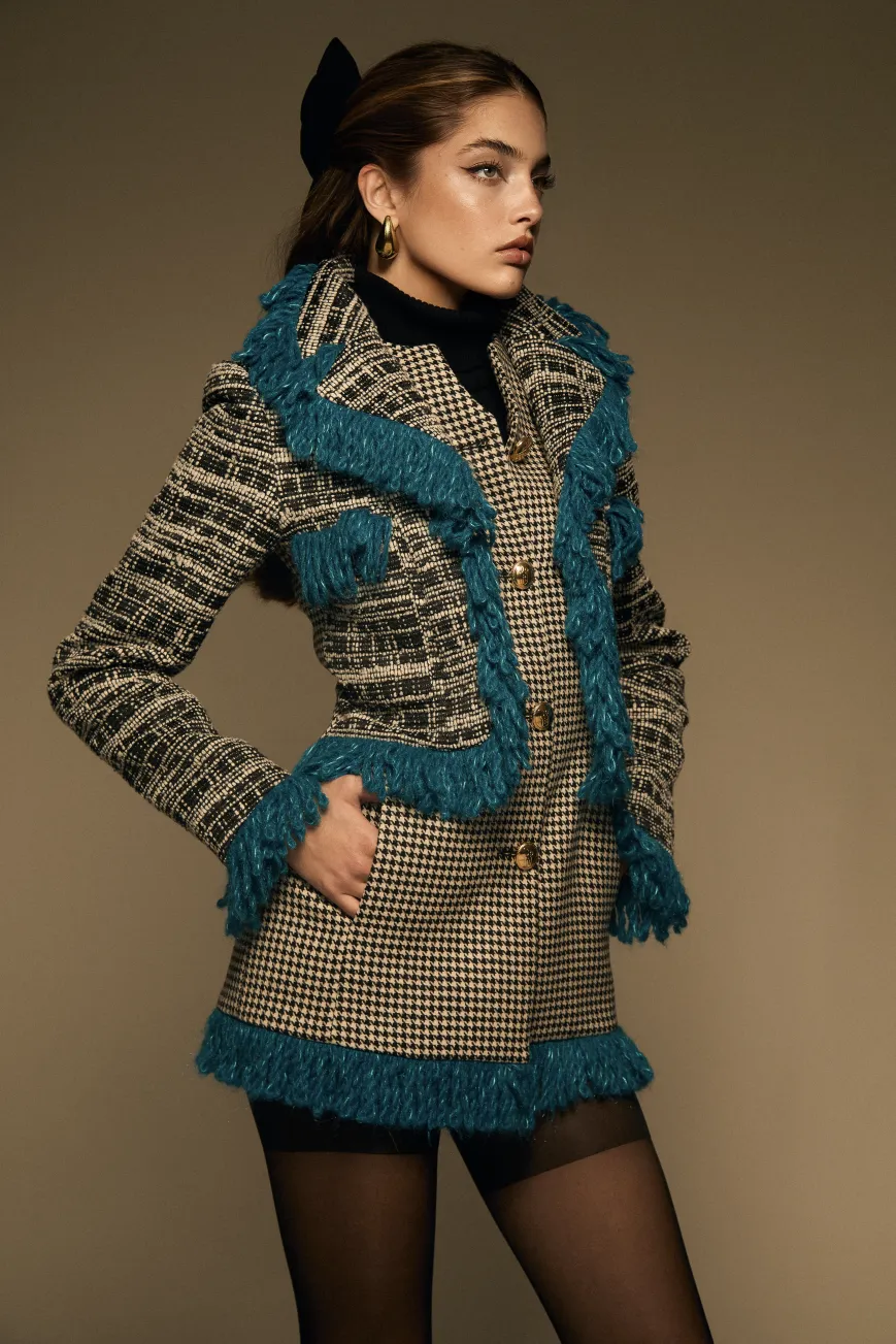 La blazer Dalmatian es una auténtica oda a la coquetería. Confeccionada en una combinación de pata de gallo y cuadro lanoso en blanco y negro, este diseño entallado a la figura crea el efecto de llevar una chaqueta sobre otra, realzado por un distintivo perfilado de flecos azules que recorre todo su contorno. Su cierre frontal con botonadura dorada y los bolsillos delanteros aportan un toque clásico y funcional, mientras que el corte entallado realza la silueta, convirtiéndola en una prenda tan elegante como femenina. Perfecta para una cena con amigas o para lucir en un evento sofisticado, esta blazer es una apuesta segura para destacar con estilo. El fit de la prenda es entallado.