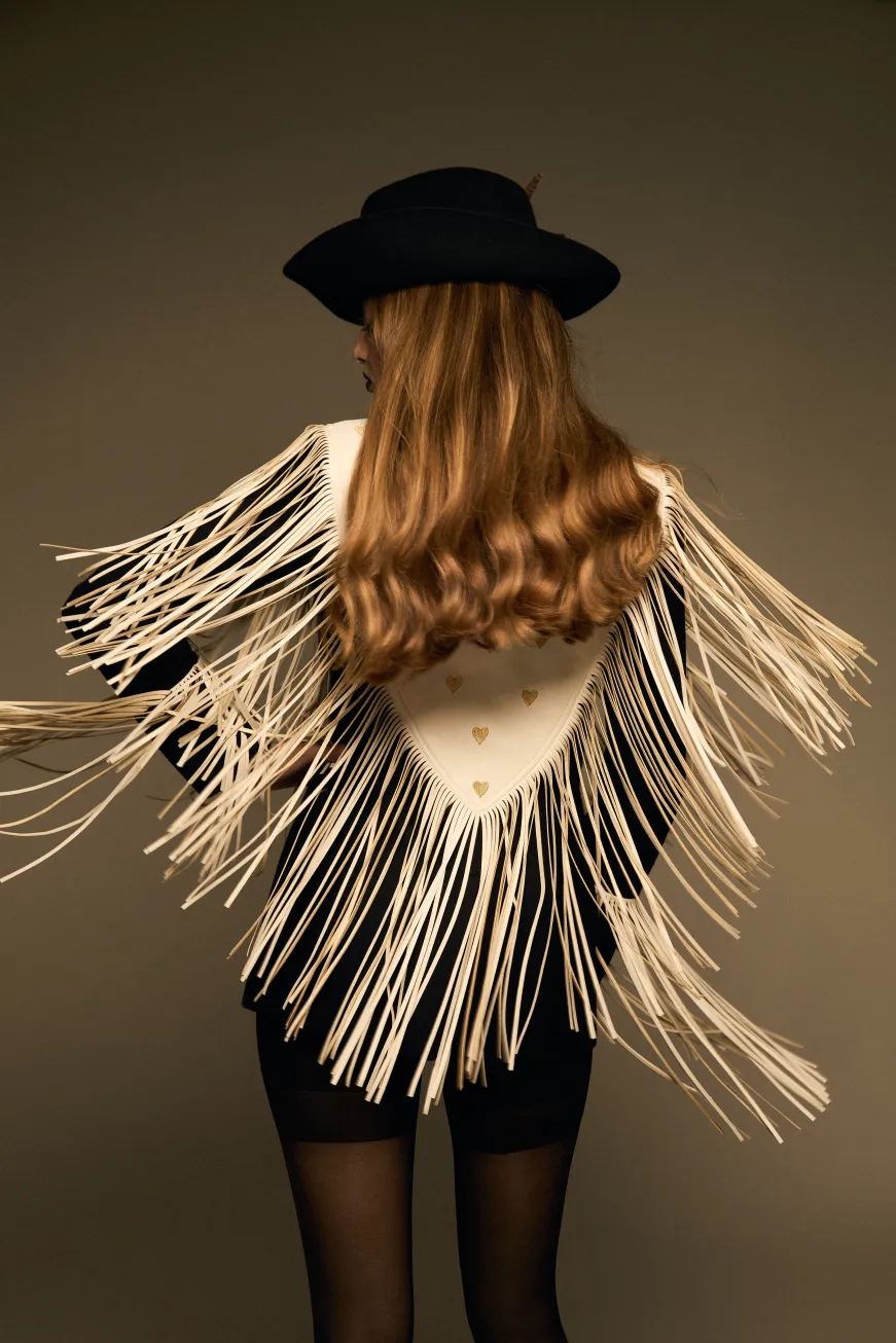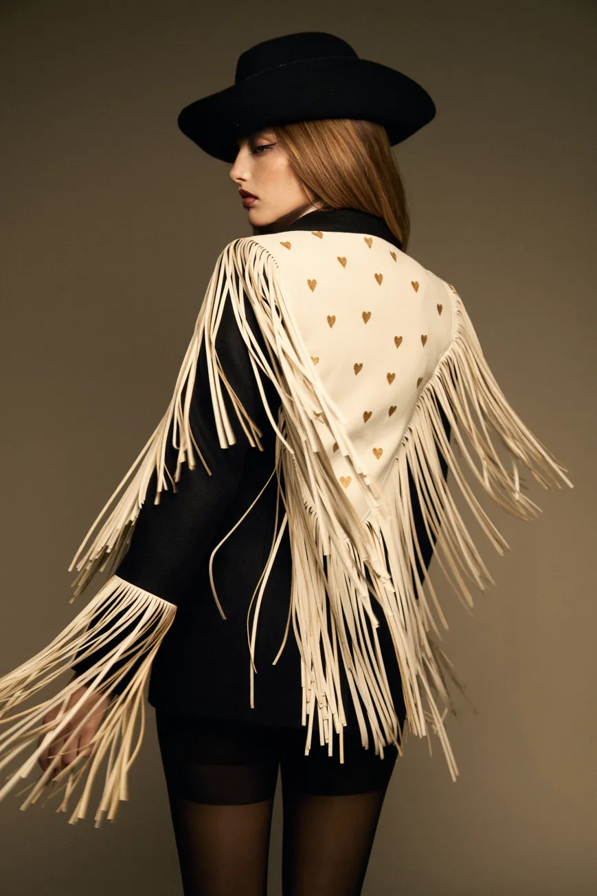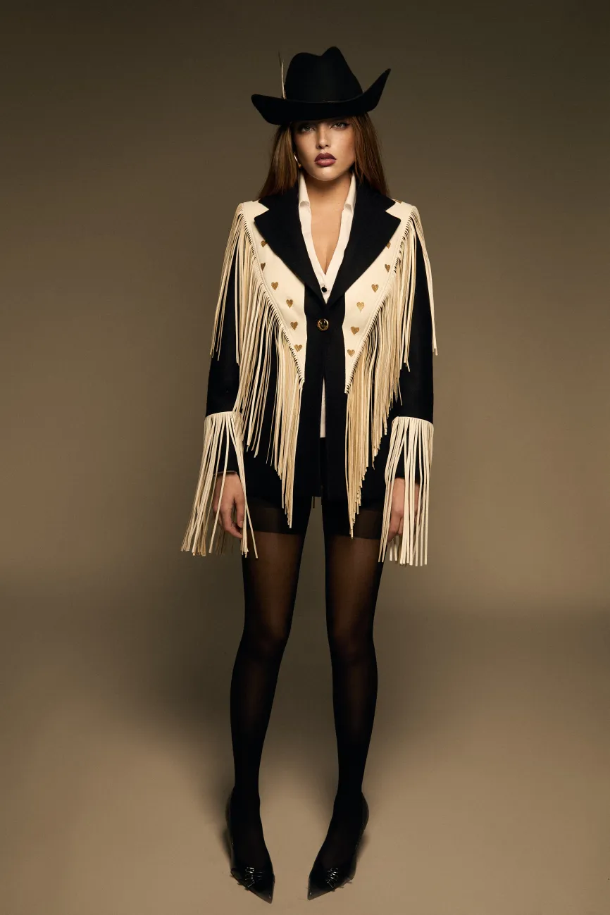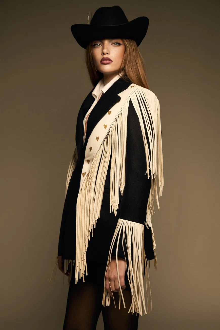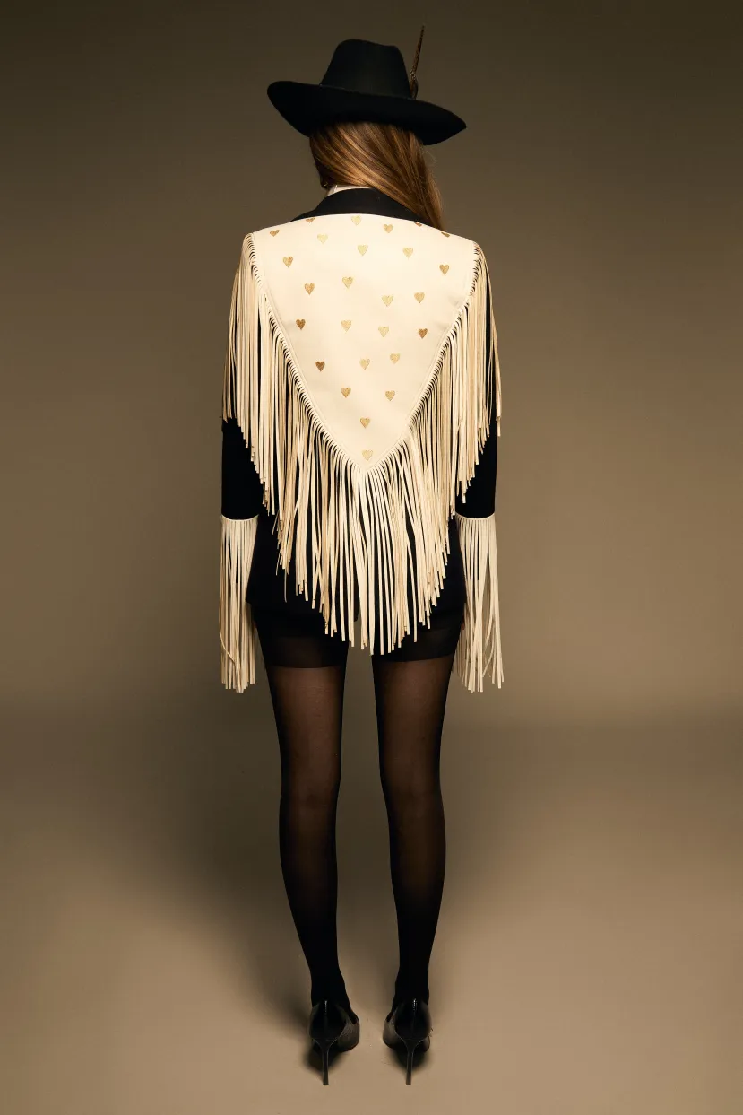 Full Heart Blazer es nuestra reinterpretación del icónico modelo Zac Brown. Confeccionado en lana negra y polipiel blanca, destaca por sus bordados de corazones dorados en la espalda y el frente. Está enmarcado por flecos de polipiel blanca que recorren todo el contorno y las mangas, aportando movimiento y estilo.