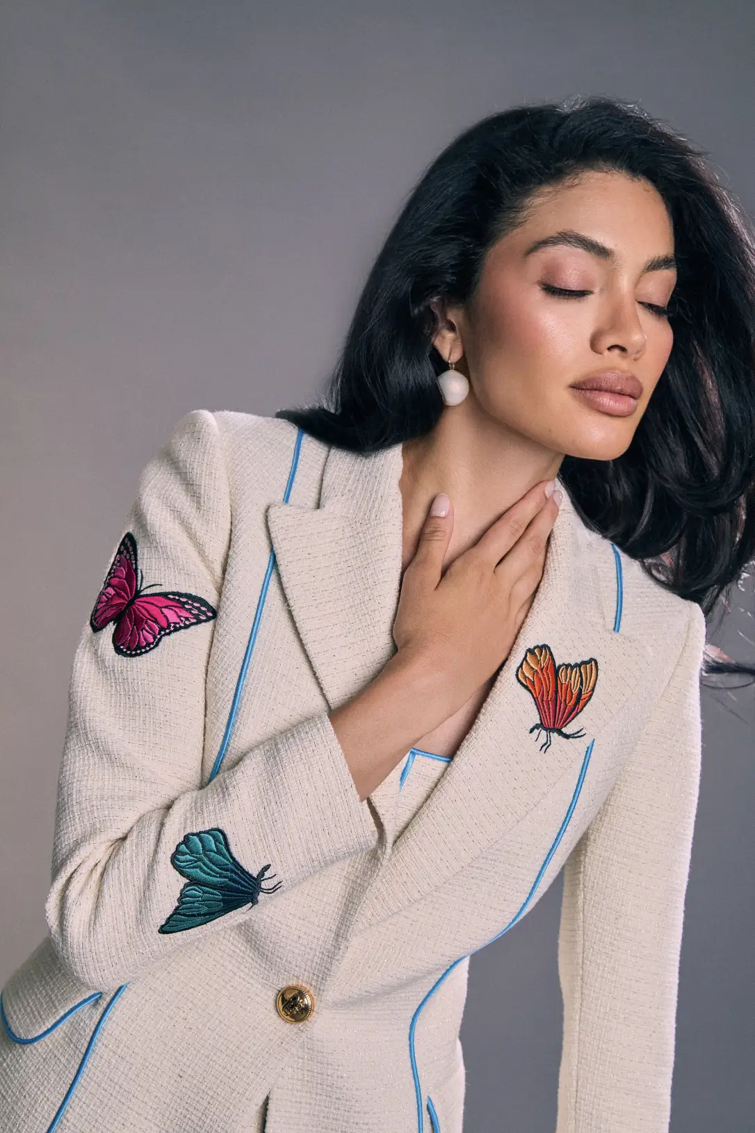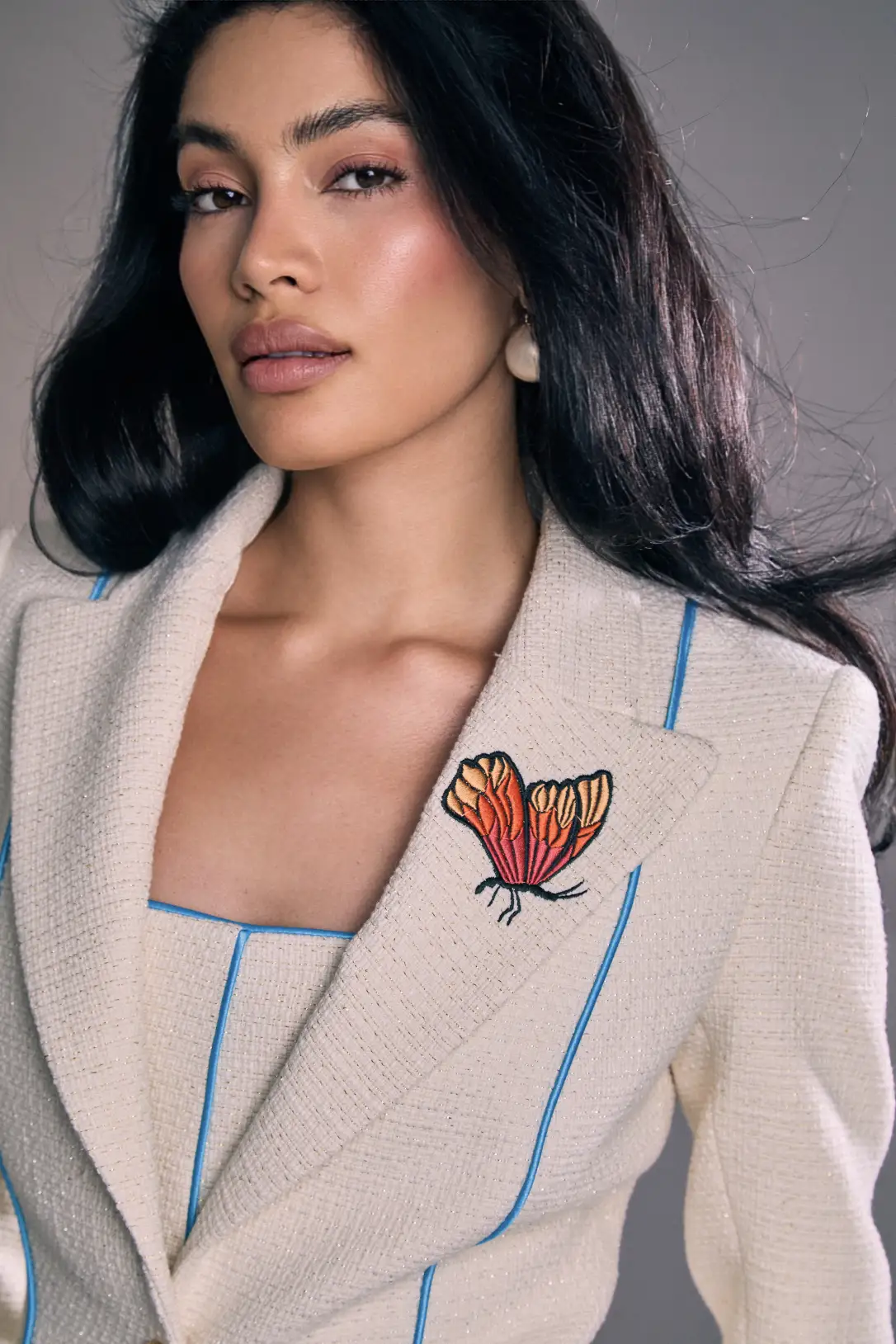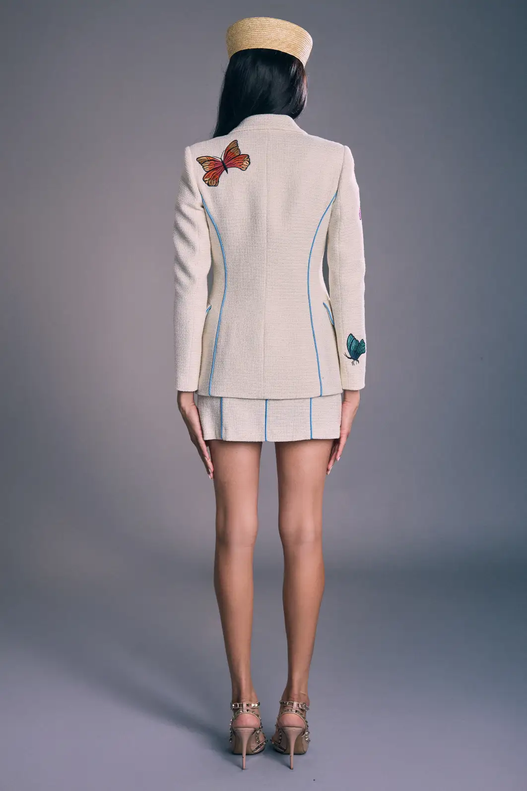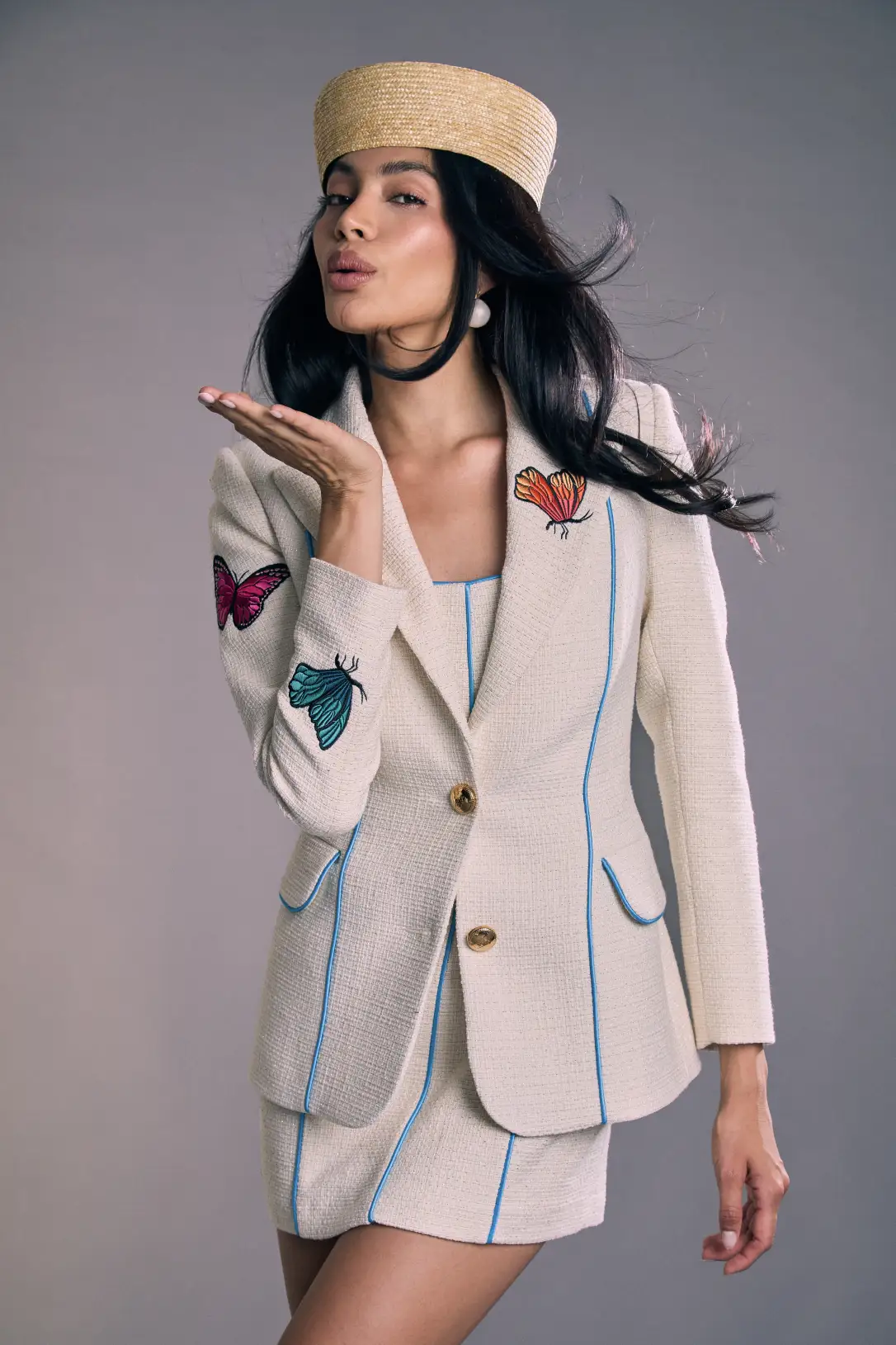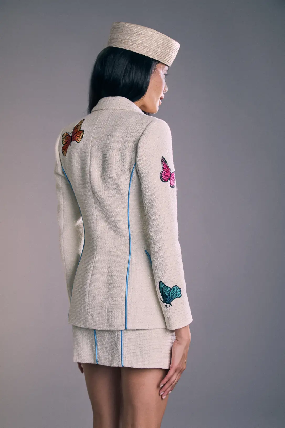 La Blazer Jackie es una americana de sastrería en marfil texturizado, realzada por un ribete azul turquesa que recorre las costuras y define la silueta con precisión. De botonadura sencilla y cintura entallada, presenta hombros estructurados y líneas verticales que estilizan y alargan la figura; los botones dorados aportan un acabado sofisticado. Pequeños bordados de mariposas en solapa, mangas y espalda suman un detalle femenino y contemporáneo que transforma la pieza en un básico con personalidad. Llévala con el vestido a juego para un total look elegante de día a noche, o combínala con pantalones de sastrería y vestidos para elevar cualquier estilismo con un aire refinado y moderno.