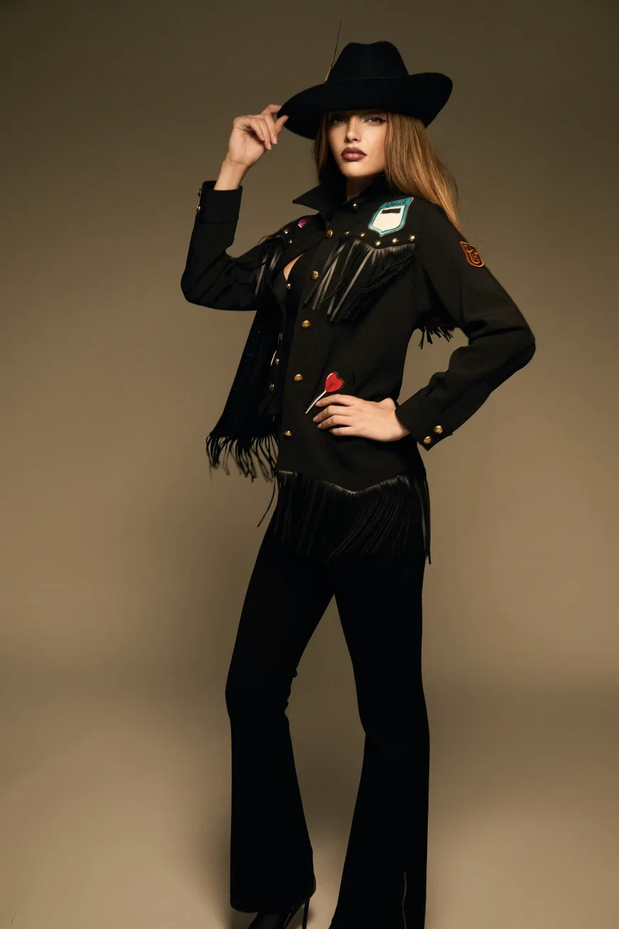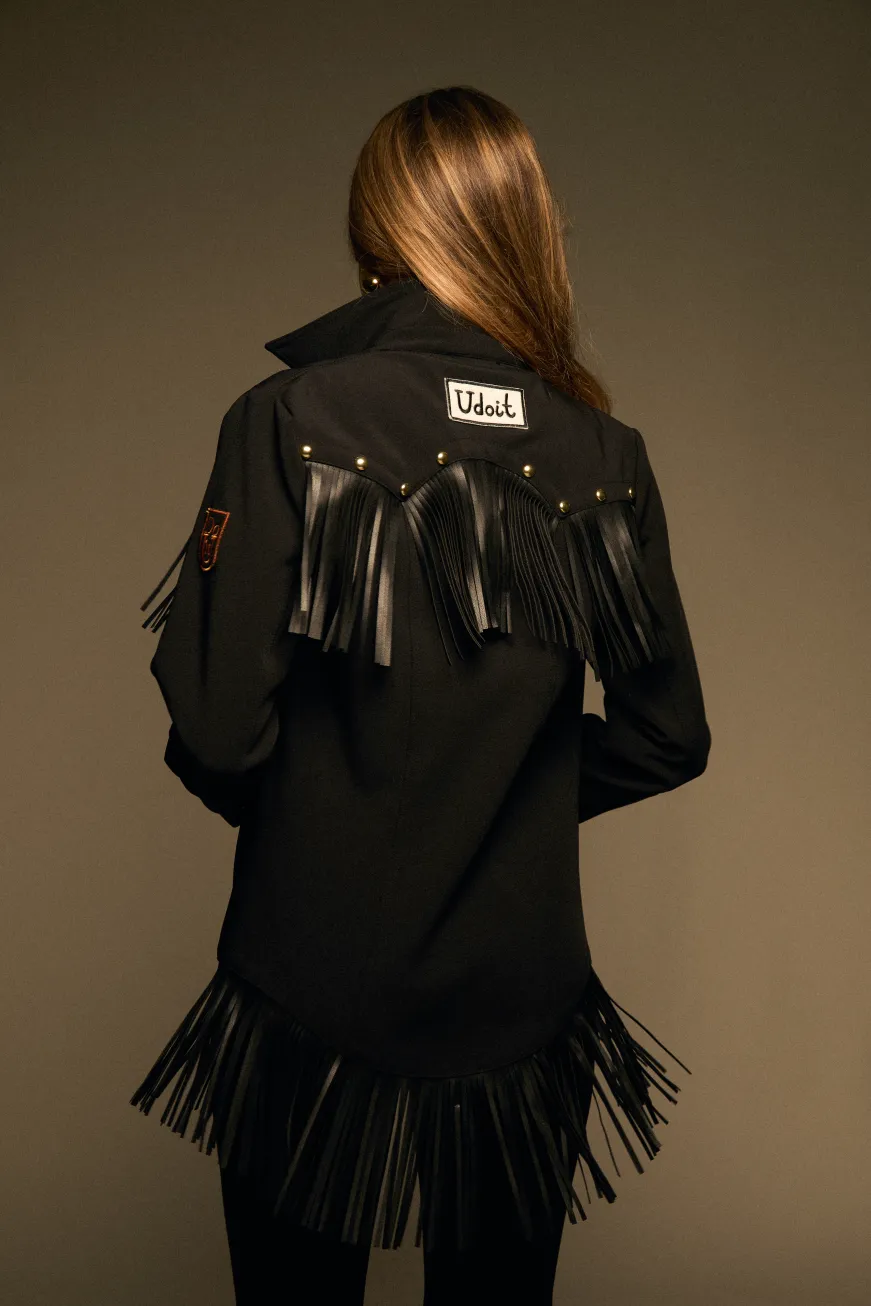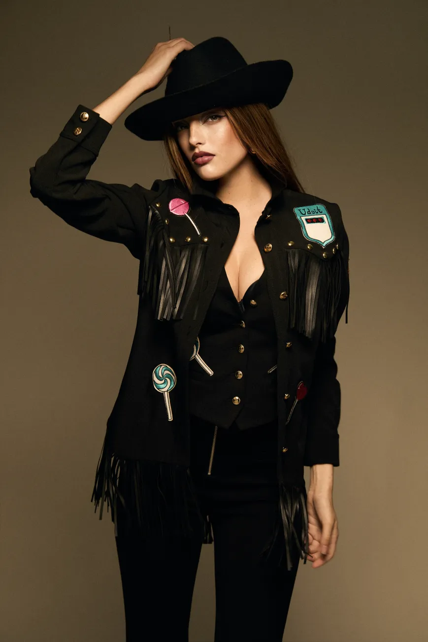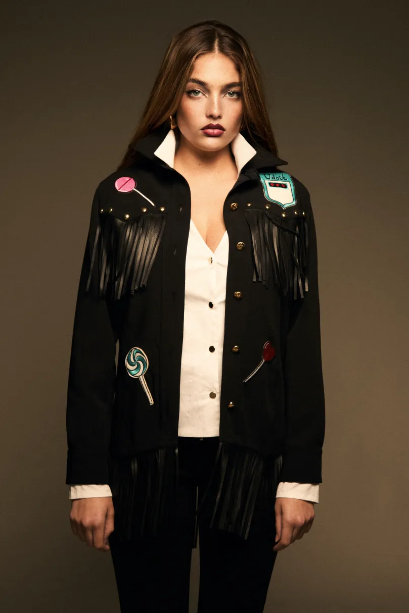 La sobrecamisa Candy Shop con flecos es una prenda divertida y llena de personalidad. Decorada con flecos de polipiel, tachuelas doradas y parches de caramelos, combina dramatismo y encanto en una pieza única.