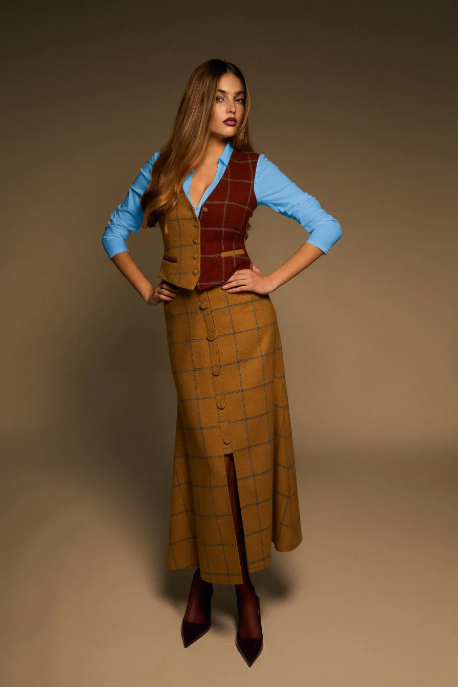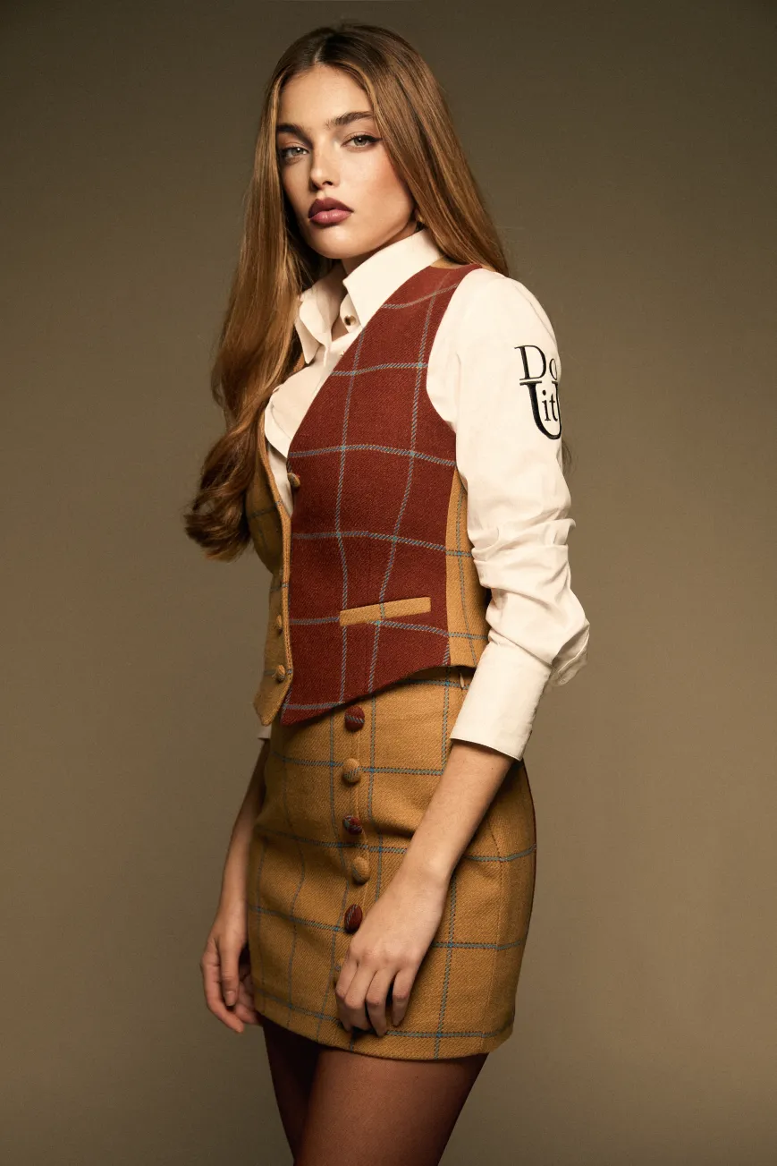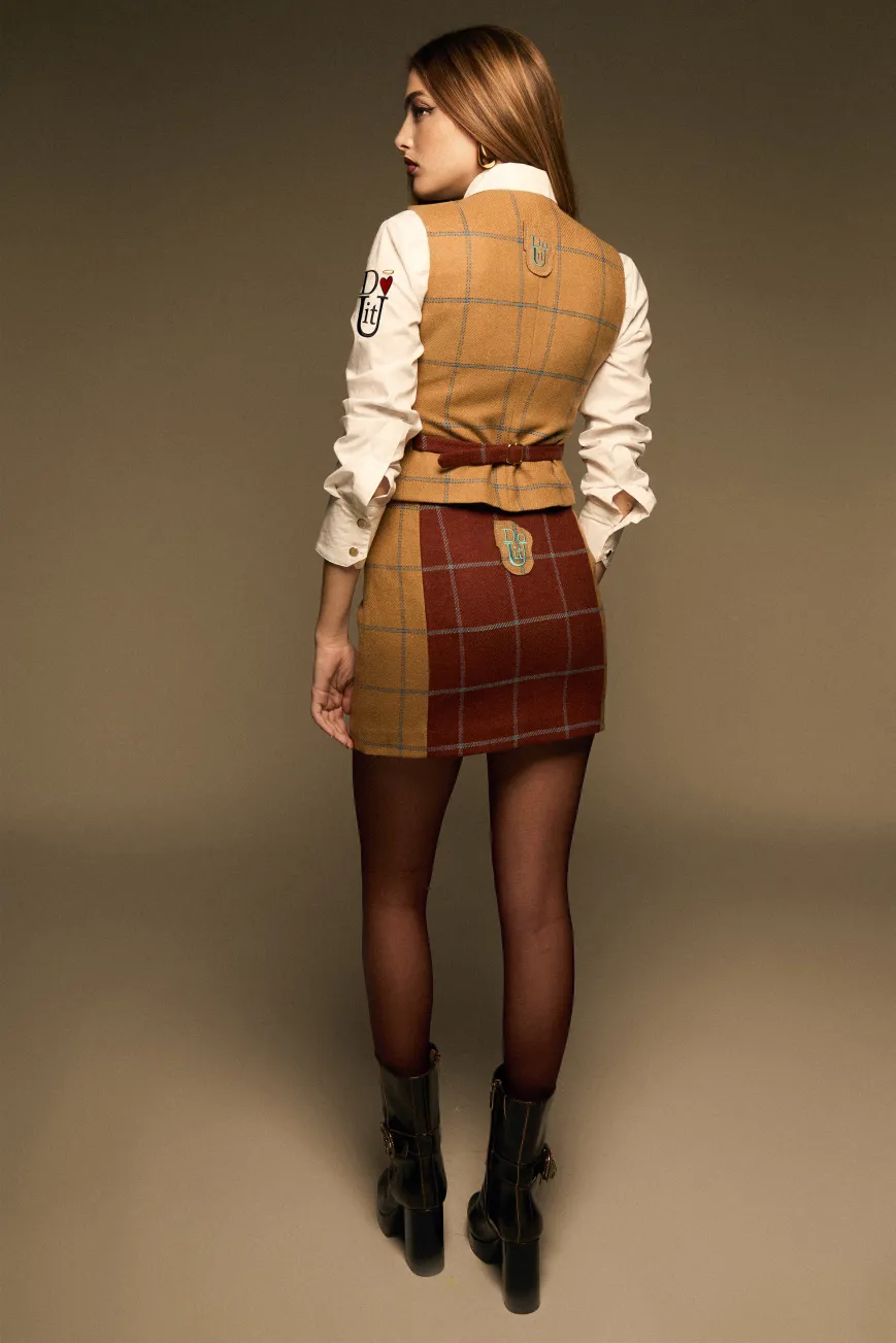 El chaleco Bandida es una prenda elegante y versátil, ideal para combinar. Su diseño juega con dos estampados de cuadro cálido en camel y marrón, ambos atravesados por una delicada línea azul que aporta contraste y personalidad. De corte entallado, presenta cuello en V, cierre frontal con botones, tirante ajustable en la espalda y un parche con el logo bordado en azul, detalles que realzan su carácter sofisticado. Perfecto para lucir como parte del traje de tres piezas Bandida o para llevar sobre blusas y camisas, este chaleco añade un toque chic a cualquier look. El fit de la prenda es entallado.