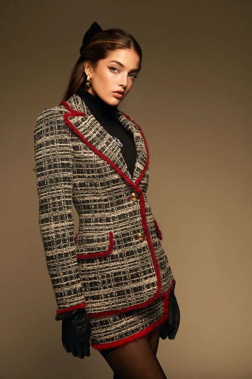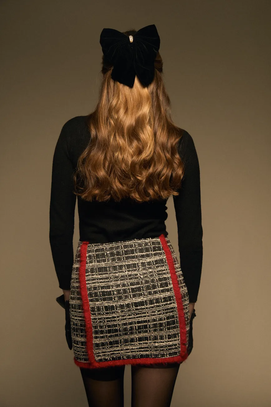 La minifalda Cruella es una pieza chic y preppy, confeccionada en un elegante tejido lanoso en blanco y negro con un delicado ribete burdeos que recorre todas sus costuras. De tiro medio y corte mini, es una prenda versátil que aporta sofisticación a cualquier look.