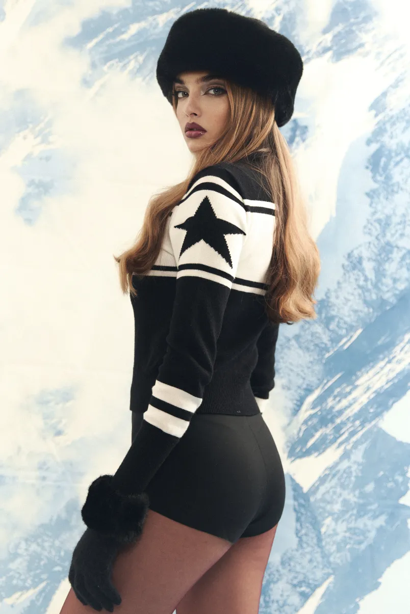 Stars jersey es un suave y calentito jersey con divertidos motivos que juegan con el blanco y negro, con estrellas en ambas mangas y rayas en el frente con el nombre de la marca y mangas. Con un fit entallado que favorece la figura. Lo puedes combinar con toda la colección. El fit de la prenda es entallado.